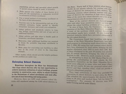In view of these facts, the Commission, with the co-operation of the State Education Department, completed a study of the problems which contract districts and non-resident pupils have created. It also studied the practical obstacles which have prevented enlargement of the city school districts.