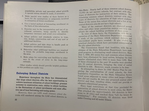 Since legal restrictions at that time precluded the annexation of school districts to most cities, the Master Plan attached the approximately 500 districts in these areas to 38 cities and marked them βleft for future determination.β For example, 62 districts were listed under Corning and 42 under Ithaca.