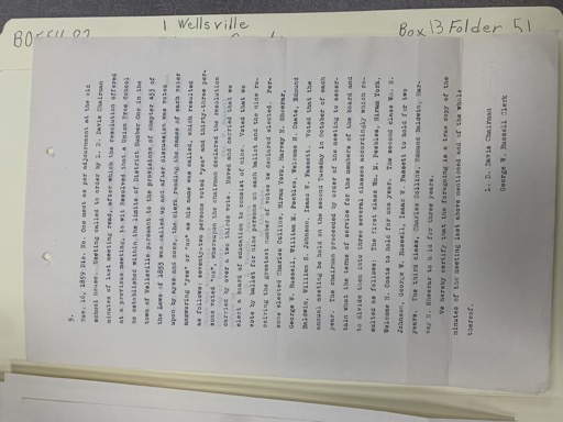 Nov. 16, 1859. Dis. No. One meet as per adjournment at the old school house. Meeting called to order after the resolution offered at a previous meeting, to wit Resolved that a Union Free School be established within the limits of District Number One in the town of Wellsville pursuant to the provisions of chapter 433 of the Laws of 1853 was read, after discussion the clerk called up and the names of each voter upon by eyes and noses, the clerk reading the names of each voter answering "yes" or "no" as his name was called, which resulted as follows: seventy-two persons voted "yes" and thirty-three persons voted "no", whereupon the chairman declared the resolution carried by over a two thirds vote. Moved and carried that we elect a board of education to consist of nine. Voted that we elect a board of education to consist of nine. Voted by ballot for nine persons on each ballot and the nine receiving the greatest number of votes be declared elected. Per- sons elected Charles Collins, Hiram York, Harvey M. Shear, George W. Russell, William M. Peebles, Welcome H. Coats, Edmund Belwin, William S. Johnson, Isaac W. Rassett. Voted that the chairman proceed by order of the meeting to as- sign what the terms of service for the members of the board and to divide them into three several classes accordingly which re- mained to be done. The chairman proceeded to assign the terms of service for the members of the board and to divide them into three several classes accordingly which re- mained to be done. The first class to hold for one year. The second class to hold for two years. The third class to hold for three years. The first class Wm. Mi. Peebles, Hiram York, Welcome H. Coats to hold for one year. The second class Wm. S. Johnson, George W. Russell, Isaac W. Rassett to hold for two years. The third class Charles Collins, Edmund Baldwin, Har- vey M. Shearar to hold for three years.