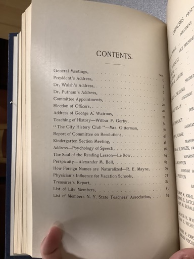 General Meetings, ……………………… PAGE President’s Address, ……………………. 5 Dr. Walsh’s Address, ……………………. 5 Dr. Putnam’s Address, ………………….. 6 Committee Appointments, ……………….. 9 Election of Officers, ………………….. 20 Address of George A. Watrous, …………… 22 Teaching of History—Wilbur F. Gorby, ……. 34 “The City History Club”—Mrs. Gitterman, … 36 Report of Committee on Resolutions, …….. 46 Kindergarten Section Meeting, ………….. 48 Address—Psychology of Speech, …………. 56 The Soul of the Reading Lesson—Le Row, …. 64 Perspicuity—Alexander M. Bell, …………. 67 How Foreign Names are Naturalized—R. E. Mayne, 69 Physician’s Influence for Vacation Schools, 74 Treasurer’s Report, …………………… 82 List of Life Members, ………………….. 83 List of Members N. Y. State Teachers’ Association, 84